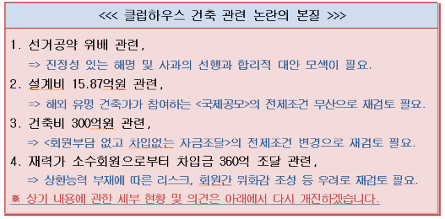 맞는 합리적이고 가성비 높은 클럽하우스 건축 관련 계획을 다시 수립해 주실 것을 부탁드립니다.